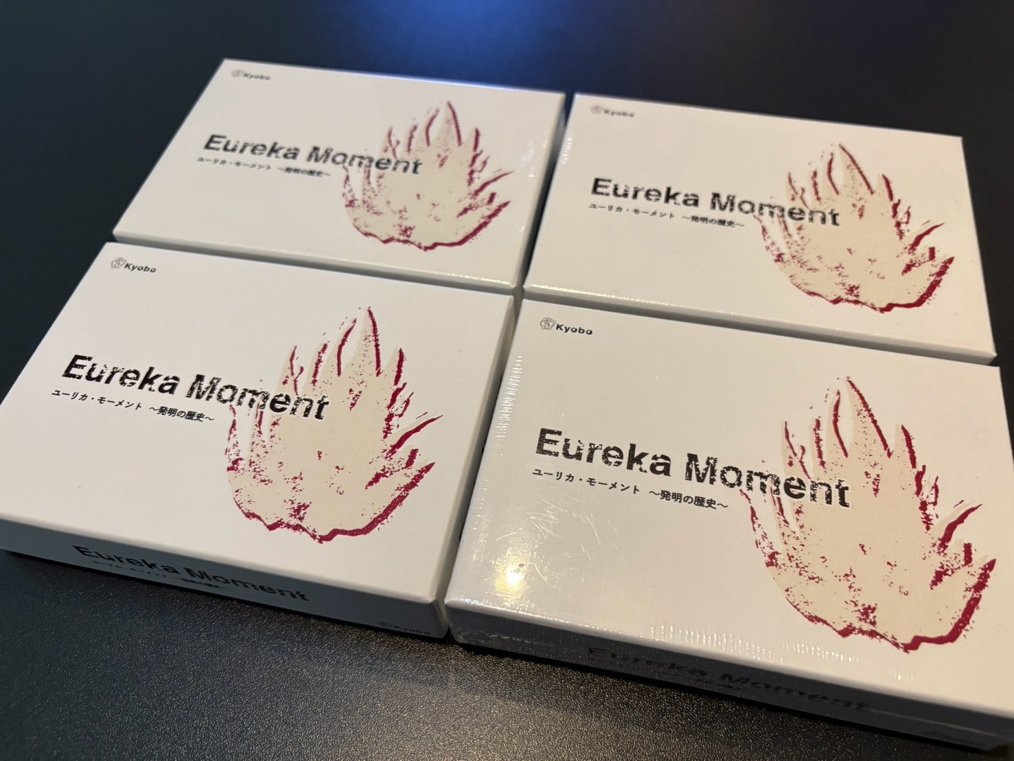 『Eureka Moment ~発明の歴史~』(ユーリカ・モーメント)は、古代から現代までの発明をつなぎ合わせて、自分だけの文明史をつくる拡大再生産カードゲームです。プレイヤーは、知識や技術を駆使して次々と発明を生み出し、時代の先端を切り開いていきます。