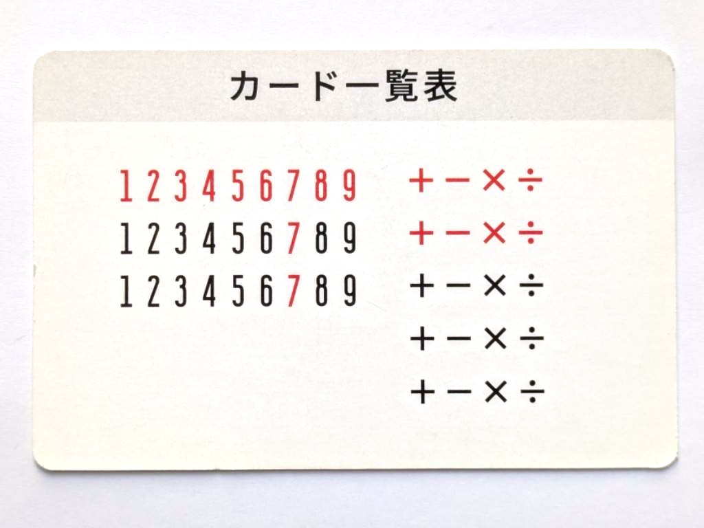 各1〜9。一部は赤カードでスコアになります(7のみ赤が3枚、他は通常2枚+赤カード1枚) - 演算子カード:20枚